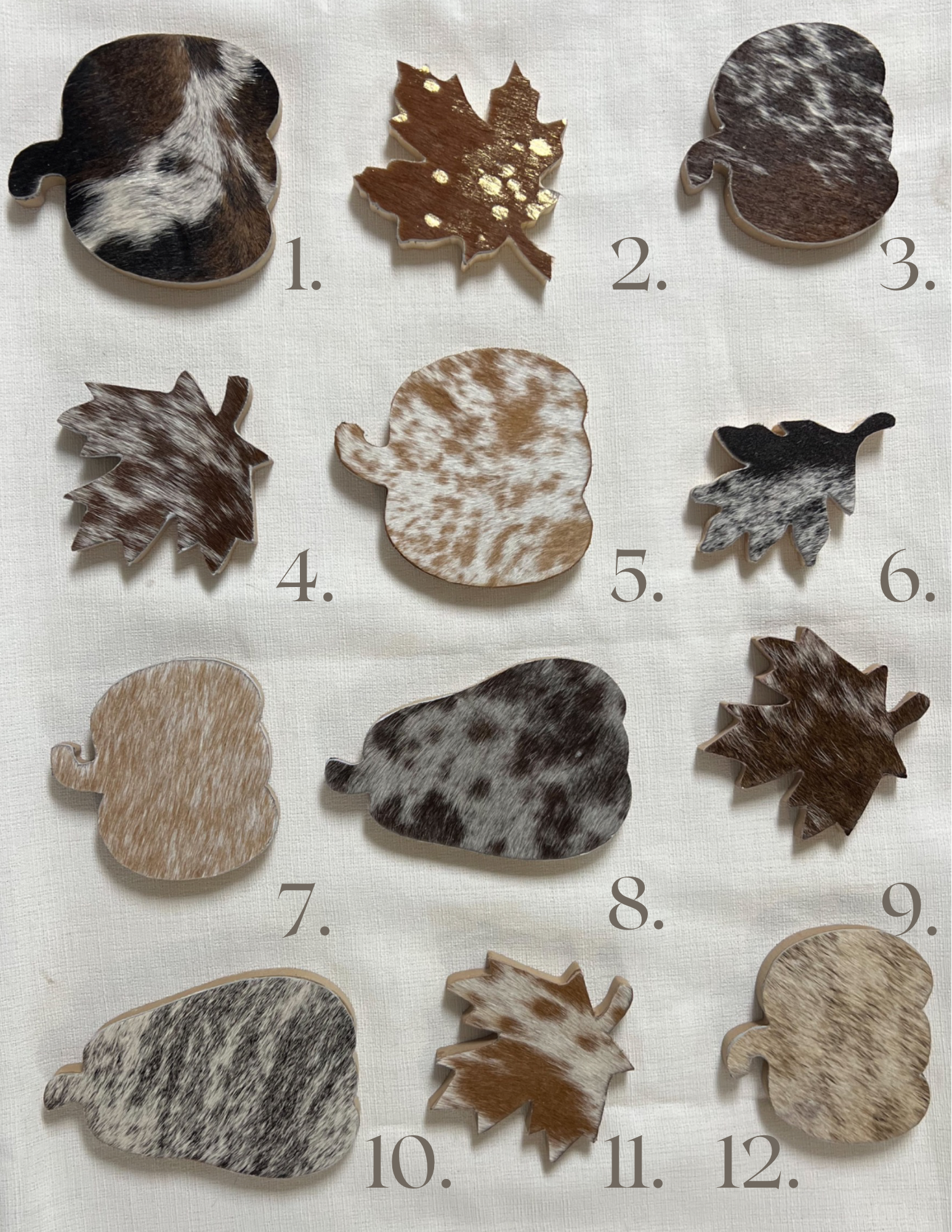 Inventory › 4 Cowhide Leaves Image 1 of 4 Image 2 of 4 Image 3 of 4 Image 4 of 4 4 Cowhide Leaves $15.00 4 inchesSet of 4 Cowhide Wooden Leaves Color: 1. Tri (blk/white/red) 2. Gold Acid 3. Med and Dark Brown 4. Dark Red / White 5. Tan / White 6. Black / White 7. Tan / White 8. Dark Brown / Grey 9. Brown / White 10. Grey Brindle 11. Tannish Brown / White 12. Tan Brindle 13. Silver Acid Quantity: Add To Cart Added! 4 inchesSet of 4 Cowhide Wooden Leaves