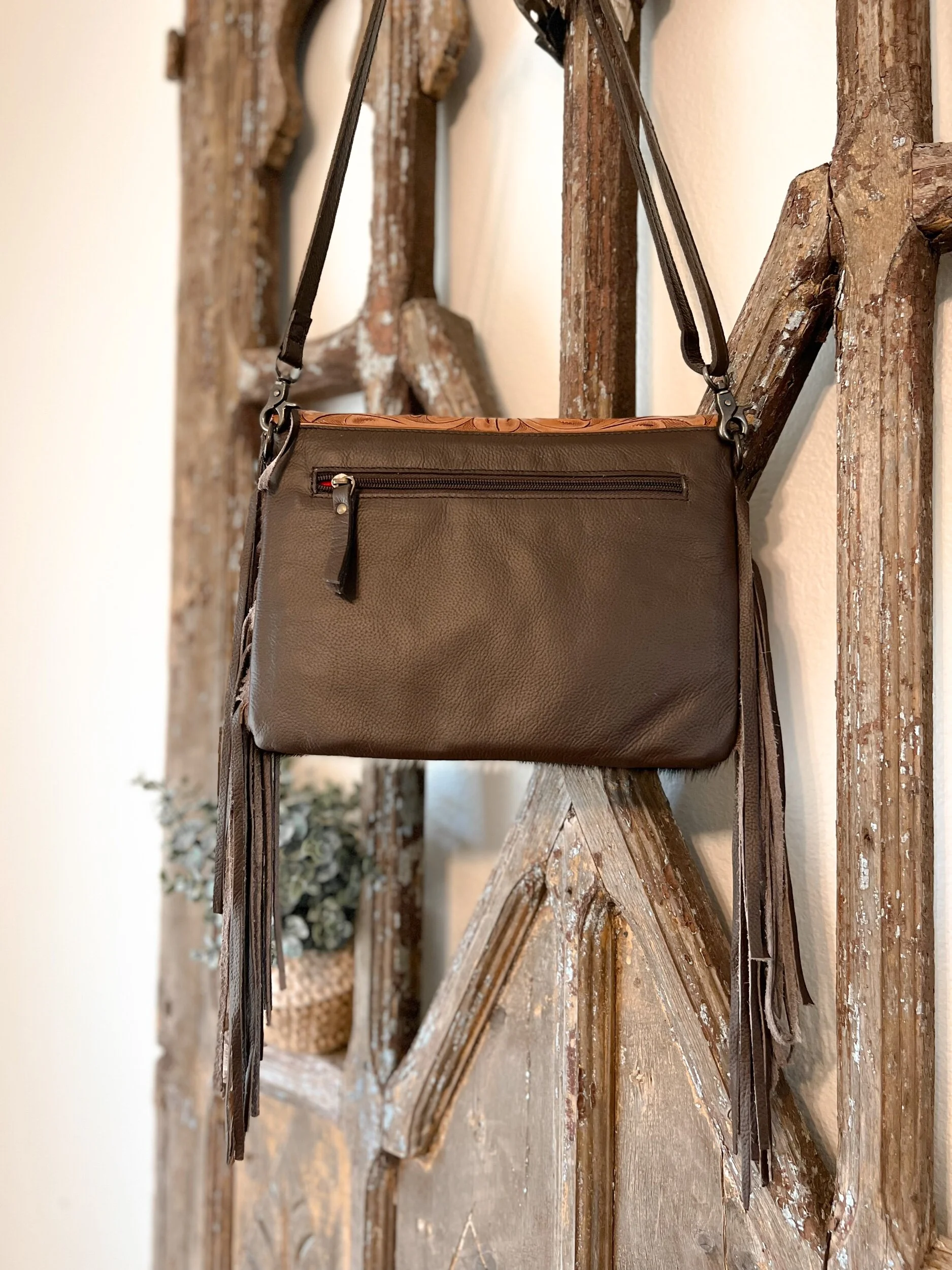 Inventory › Floral Tooled Leather Top Crossbody w/ Fringe Image 1 of 3 Image 2 of 3 Image 3 of 3 Floral Tooled Leather Top Crossbody w/ Fringe Sale Price: $75.00 Original Price: $80.00 sold out Size: 8 x 10.5“ Number: 1 2 Sold Out Added! Size: 8 x 10.5“